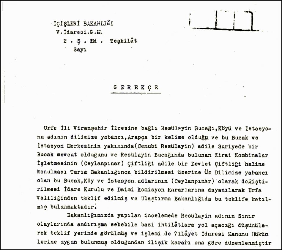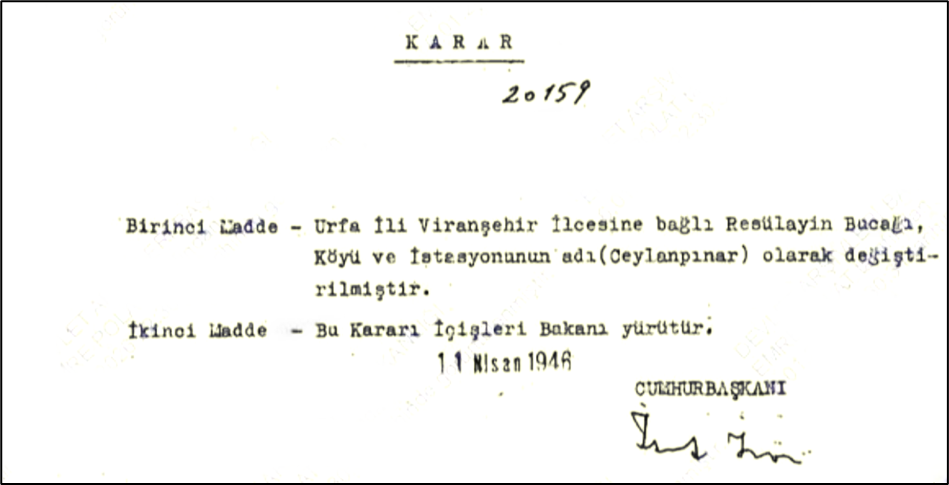 SÖZÜN UZUNU: İlki CEYLANPINAR, 1921 Türkiye-Fransa arasında gerçekleşen Ankara Antlaşması ile Fransız mandası Suriye ile Türkiye’nin sınırı belirleniyor. Bağdat Demiryolu ölçü alınıp demiryolu bizde kalacak şekilde Nusaybin’e kadar sınır olarak belirleniyor. Bu sırada Resulayn’ın ortasından geçen demiryolu şehri ikiye bölmüş. Resulayn’ın tarihi kayıtlarda MÖ 9. yüzyıla dek uzanıyor, Yeni Asur kayıtlarında Süryanice Rēş ēni {URU.re-eš-e-ni} (𒌷𒊑𒌍𒂊𒉌) “Pınar başı” olarak geçmiş. Q004028 Sennacherib 223 kaynağında MÖ 704-681 arasında hüküm süren Sînaḥḥēerība yazıtlarında “Yukarı tırmandım ve … Rēš-ēni … şehirlerinden on sekiz kanal kazdım…” geçer, muhtemelen Resulayn’dan söz ediyor.