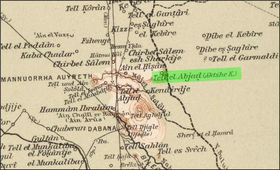 Ankara Antlaşması ile bölünmüş kent, büyük bölümü güneyde kalmış. Tel Abyad’ın adı Kiepert haritasında Aktshe K[ale] olarak da geçer.
