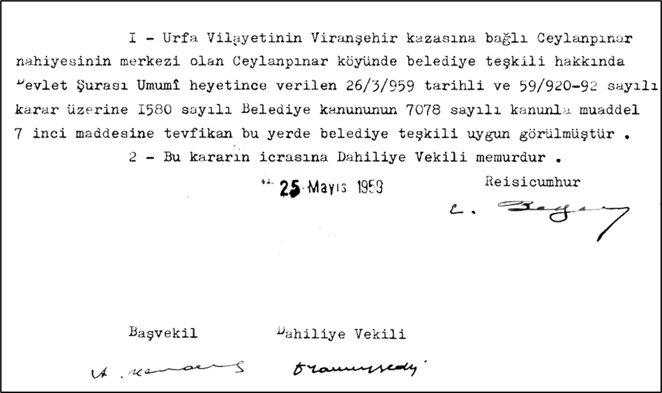 Zor sancağı mülhakatından Re’sulayn kazası merkezi (Subaşı) mevkiine naklolunmuştur. İşbu irade-i seniyyenin icrasına Dahiliye Nazırı memurdur. Fî 10 Recep sene [1]333, fî 12 Mayıs [1]331 [25 Mayıs 1915]